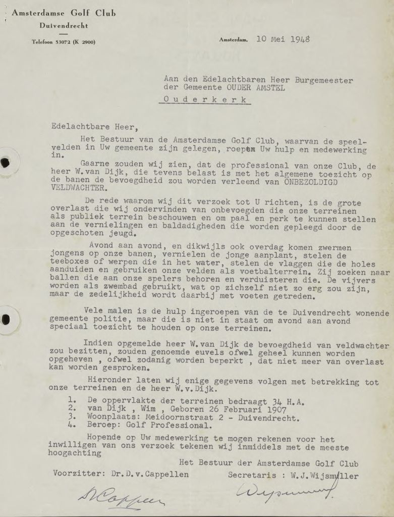 De club heeft in dit jaar te maken met vernielingen door jeugd, zo blijkt uit een bried die voorzitter D. van Capellen en secretaris W.J. Wijsmuller op 10 mei schrijven een brief aan de burgemeester van de gemeente Ouder Amstel met het verzoek dat “onze professional Wim van Dijk, die tevens belast is met het algemene toezicht op de banen, de bevoegdheid zou worden verleend van ONBEZOLDIGD VELDWACHTER”. Een citaat uit de brief die in 2023 opduikt: