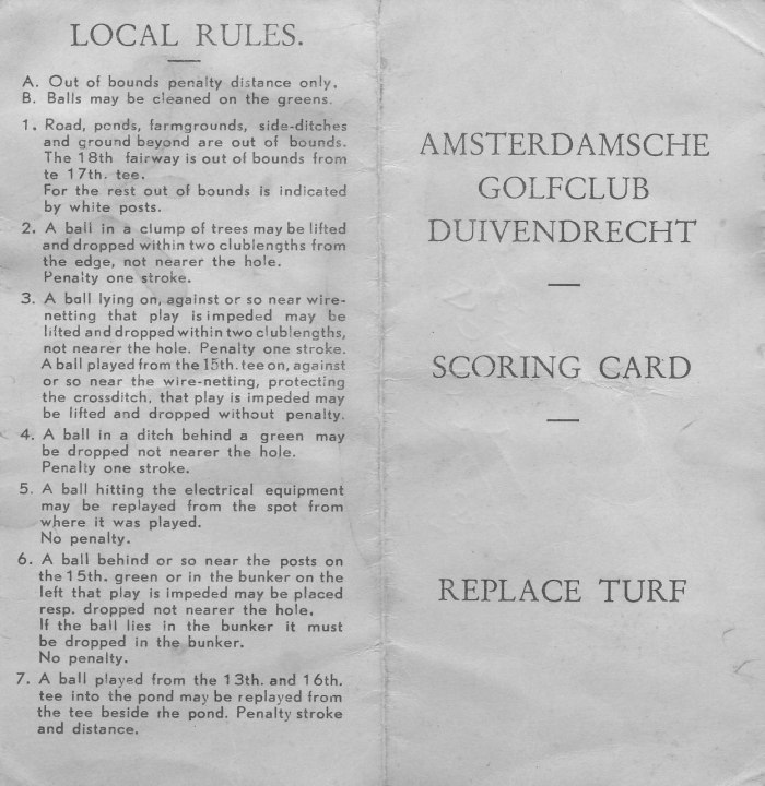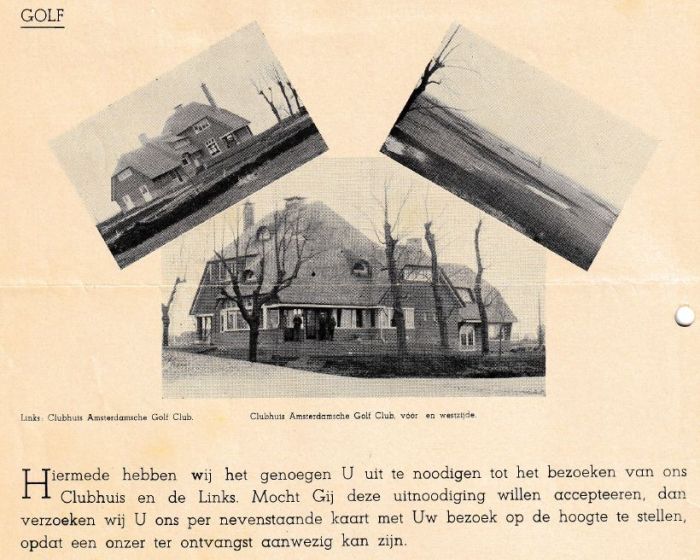 “Het Bestuur van de Amsterdamsche Golfclub heeft de eer U met een dame uit te noodigen tot het bijwonen van de officieele opening der 18-holes course te Duivendrecht op Zaterdag 14 September a.s. om half drie, 1935. De Heeren R.F. Schill en J.W. de Haan hebben zich bereid verklaard na de opening een wedstrijd te spelen tegen de club-professionals J. [Jacob] Oosterveer en W. [Wim] van Dijk.”